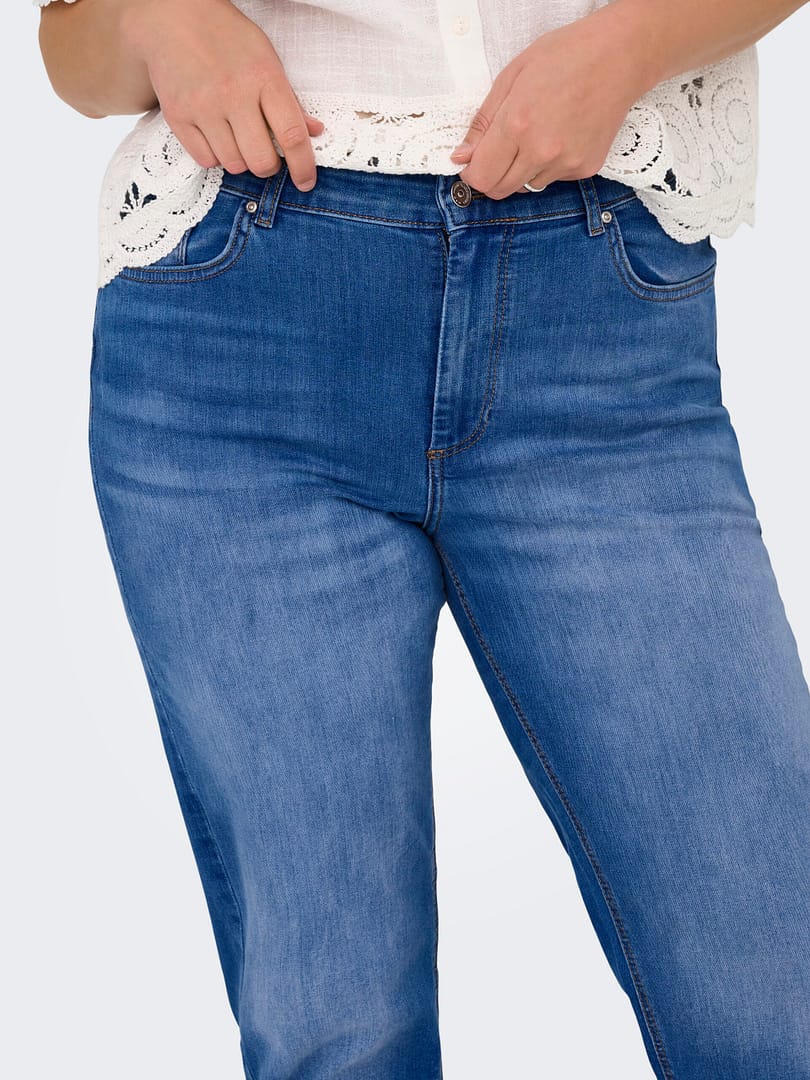 Bereik een klassieke en veelzijdige look met onze straight fit jeans in grote maten, met flatterende rechte pijpen en een comfortabele hoge taille. Het model sluit nauw aan rond de heupen en dijen en valt dan recht naar beneden, waardoor een tijdloze pasvorm ontstaat die bij alle lichaamstypes past. Het stretchdenim zorgt de hele dag voor comfort en bewegingsvrijheid.