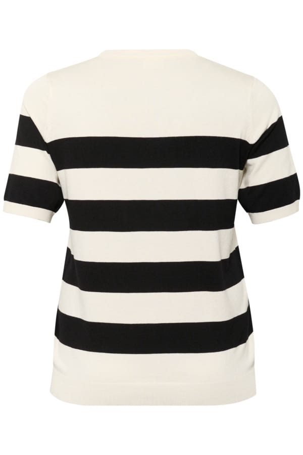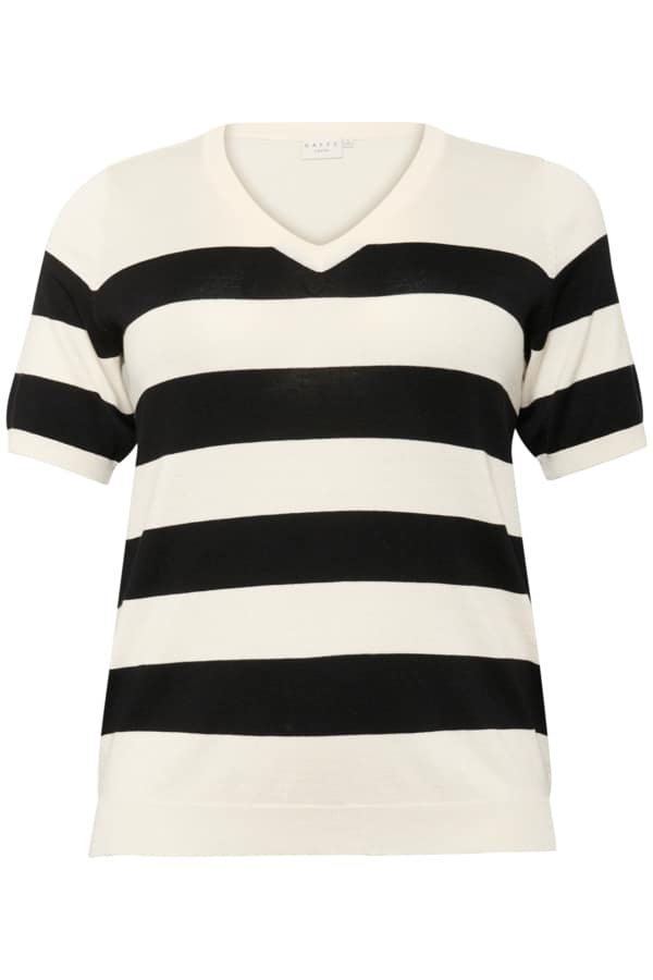 Deze dames V-hals trui combineert eigentijdse stijl met comfort. De ontspannen pasvorm, korte mouwen en brede horizontale strepen maken dit gebreide shirt ideaal voor casual en veelzijdige looks.