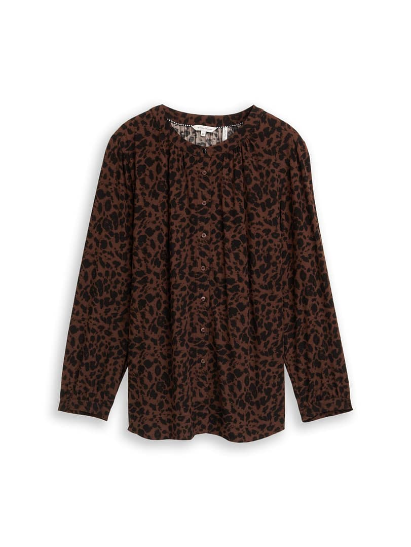 Blouse met luipaardprint en lichte plooitjes bij de halslijn. Gemaakt van een soepelvallende viscose stof.