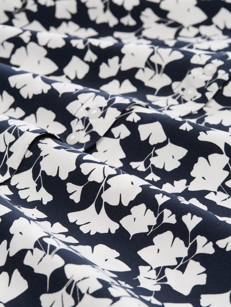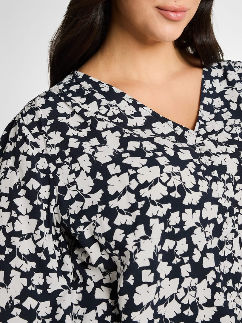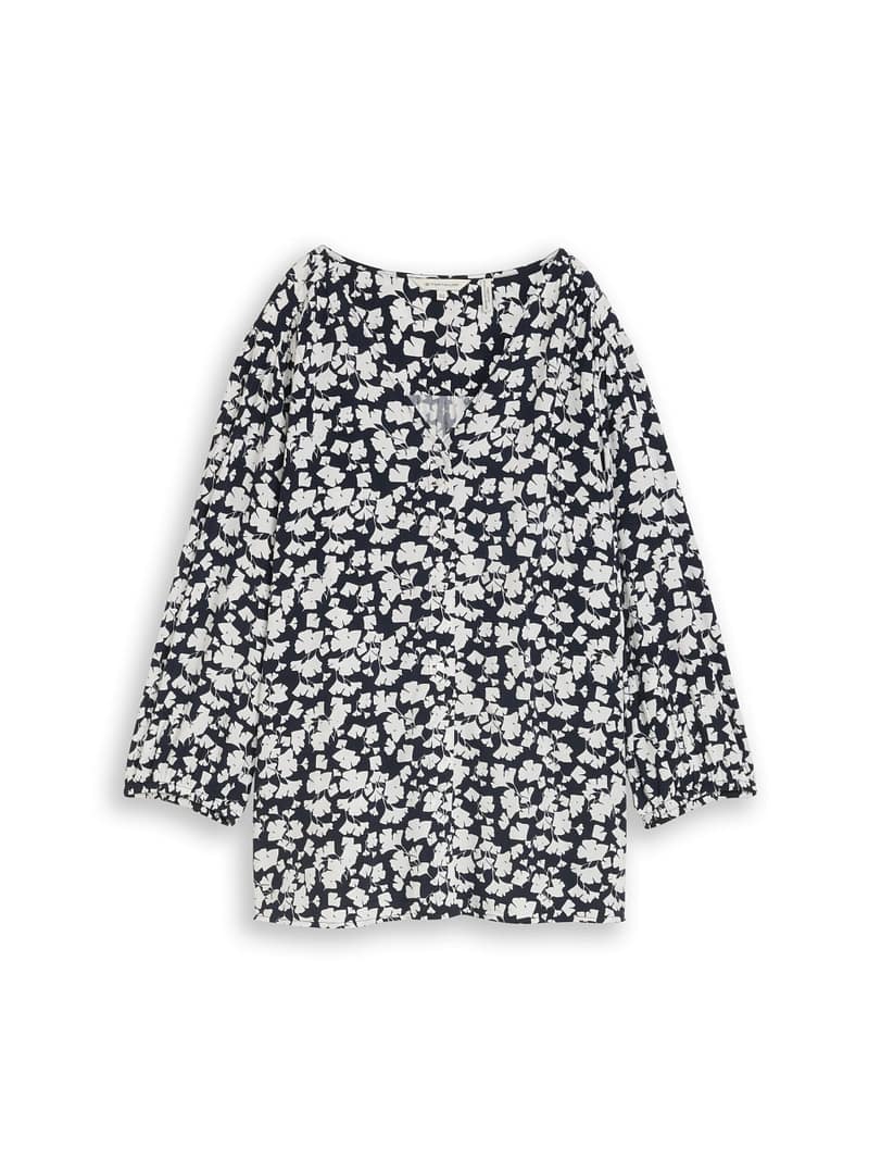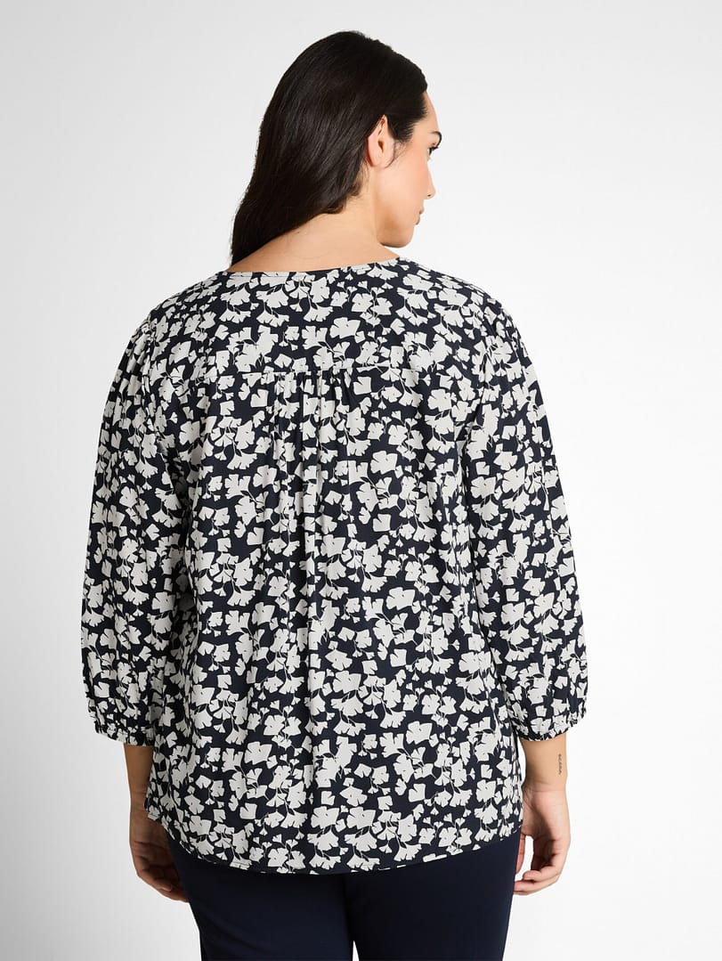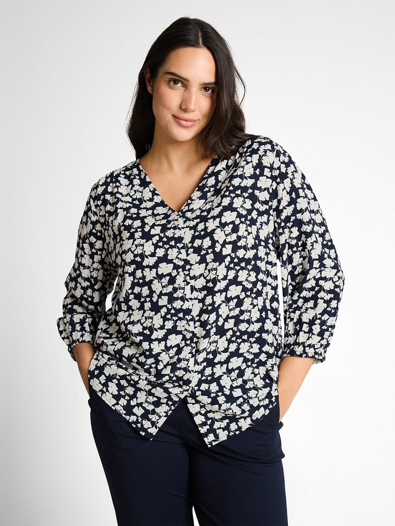 Blouse met patroon, 3/4-mouwen, V-hals en knoopsluiting. Met elastische zoom aan de mouwen en lichte plooitjes op de schouders. Gemaakt van soepelvallende viscose.
